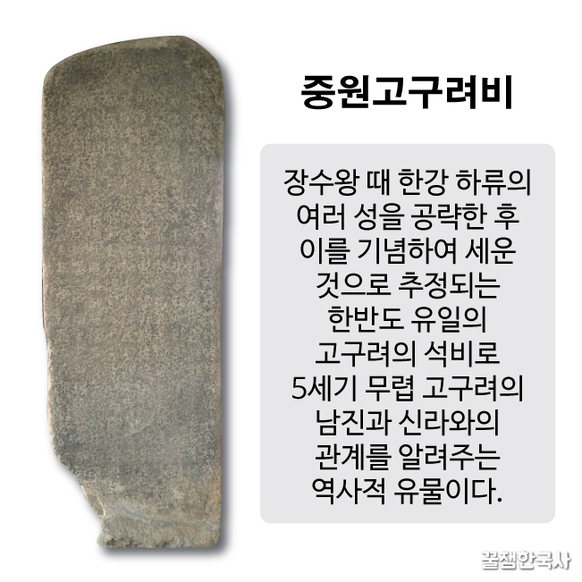 ● 장수왕 : 정복활동. 남진정책(남북조 및 유연과 동맹. 평양 천도). 백제 위례성 함락. 개로왕 전사 시킴. 중원고구려비(충주). 한강 이남 차지(죽령~남양만).