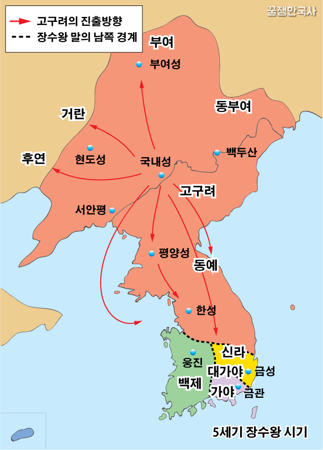 이렇게 북쪽을 안전하게 한 후 병력을 남쪽으로 돌려서 평양으로 천도(427)<★★★>한 뒤에 남진정책을 수행하여 백제를 두들겨 패버린단다.