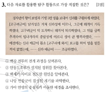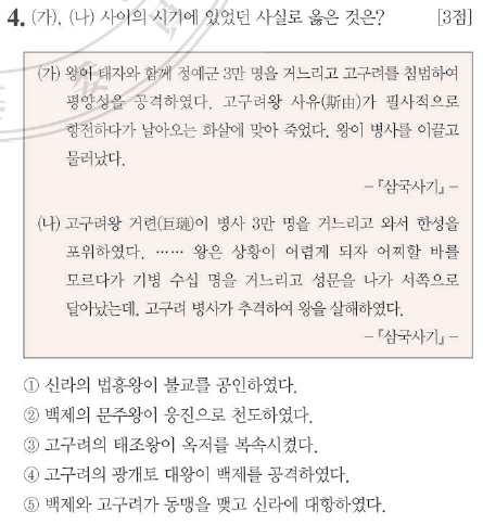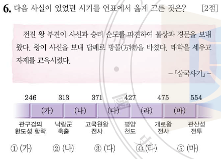 5번. 백제와 고구려 동맹은 (나)보다 뒤의 일이지.