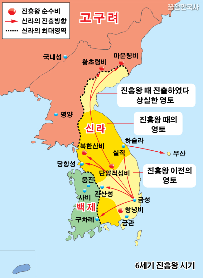아니나 다를까 울진봉평신라비(524)를 통해 신라의 영토가 동해안 북쪽 방면으로 진출했다는 것을 알 수 있고,