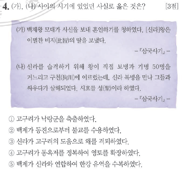 3번. 고구려의 신라로 군대파견은 광개토대왕 때니 (가)보다 전.
