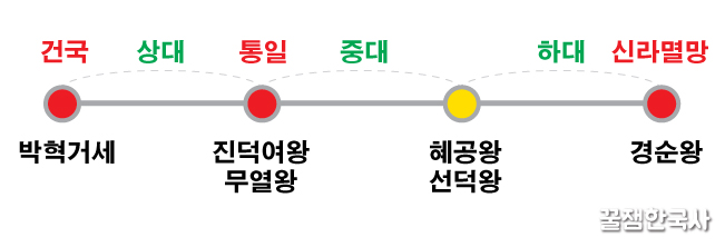 박혁거세부터 진덕여왕까지를 신라 상대라고 하고, 무열왕부터 혜공왕<★>까지를 신라 중대, 선덕왕부터 경순왕까지 신라 하대라고 해.