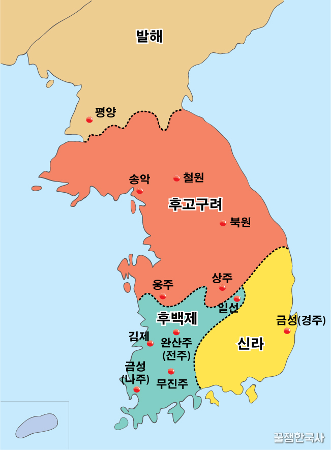 송악에서 궁예가, 완산주에서는 견훤이 들고 일어나서 후고구려, 후백제를 세운단다.