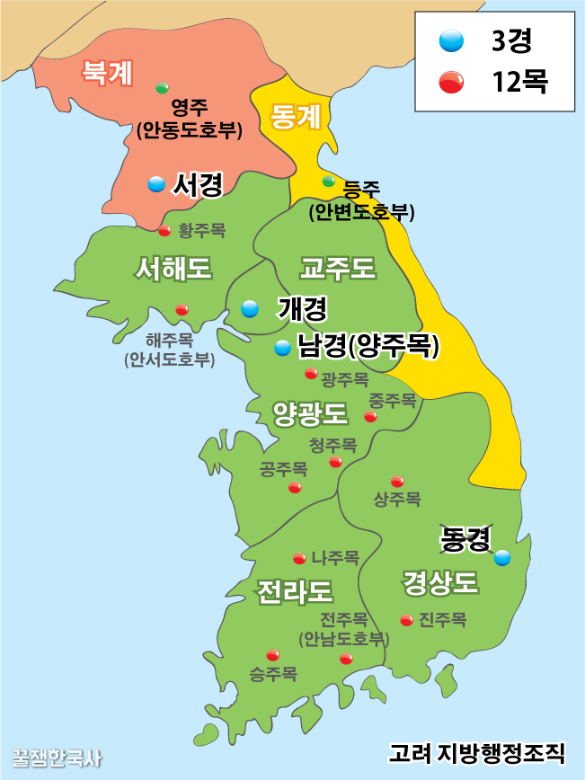 지방 행정조직은 성종 때 12목을 설치했는데<★>, 이것이 현종 때 5도 양계 체제로 바뀌어.<★>