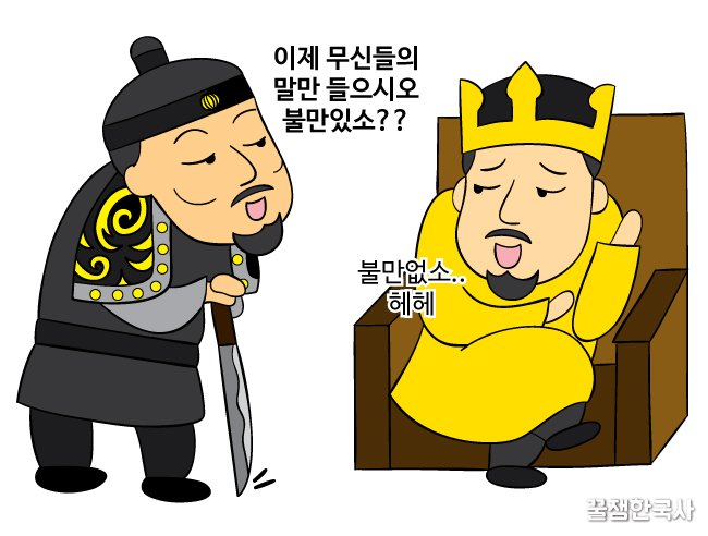 군사력을 바탕으로 무신들이 정권을 장악해서 국왕을 교체하고, 고려는 이제 무신들이 이끄는 사회가 도래한 거야.