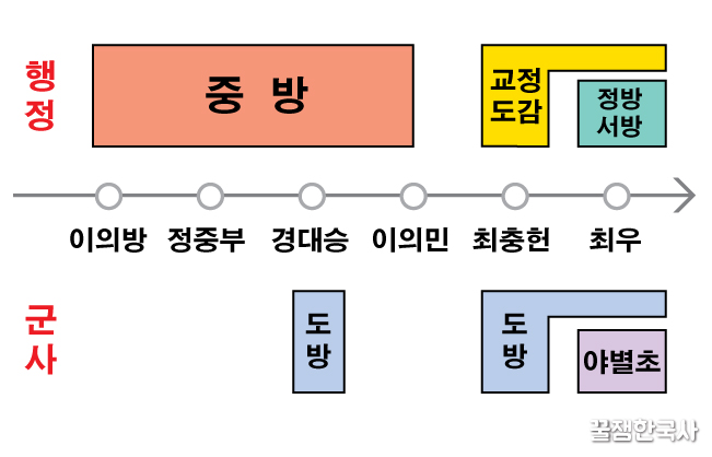무신정권 당시의 집권자와 정치기구(최고회의기구), 그리고 군사기구(군사조직)의 그림인데... 순서까지 다 외워.