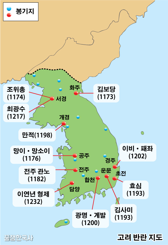 정중부가 집권하자마자 김보당이 난(1173)<★>을 일으킨 것을 시작으로 심지어 하층민까지 반란을 일으켜.