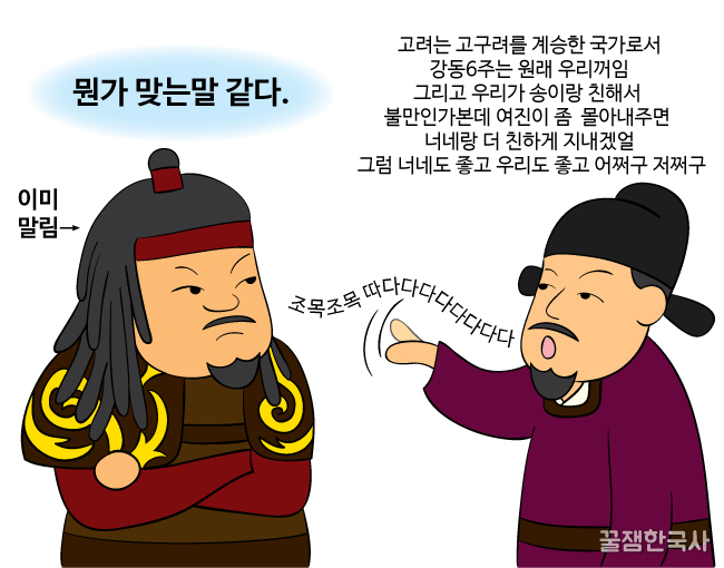 서희 : 걱정마라. 공격 안할게. 대신 우리가 강동 6주 먹는다. 원래 우리 땅이었어. 그럼 너 맘 놓고 송나라 두들겨 패도록 우린 잠자코 있을게. 약소~옥!