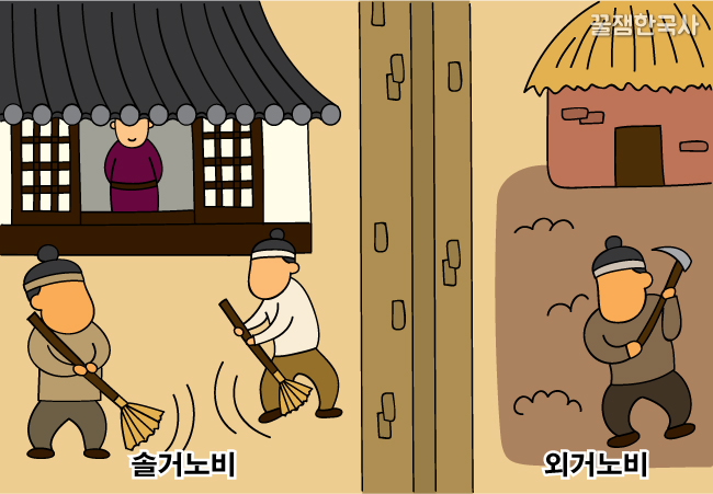 사노비는 주인집에서 거주하면서 허드렛일을 하는 솔거노비와 밖에 살면서 사유지 경작하는 외거노비로 나뉘지.