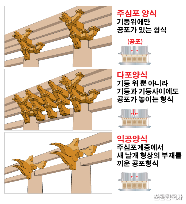 주심포 양식은 지붕의 무게를 분산시키기 위해 기둥 위에 짜임새를 만든 거야.