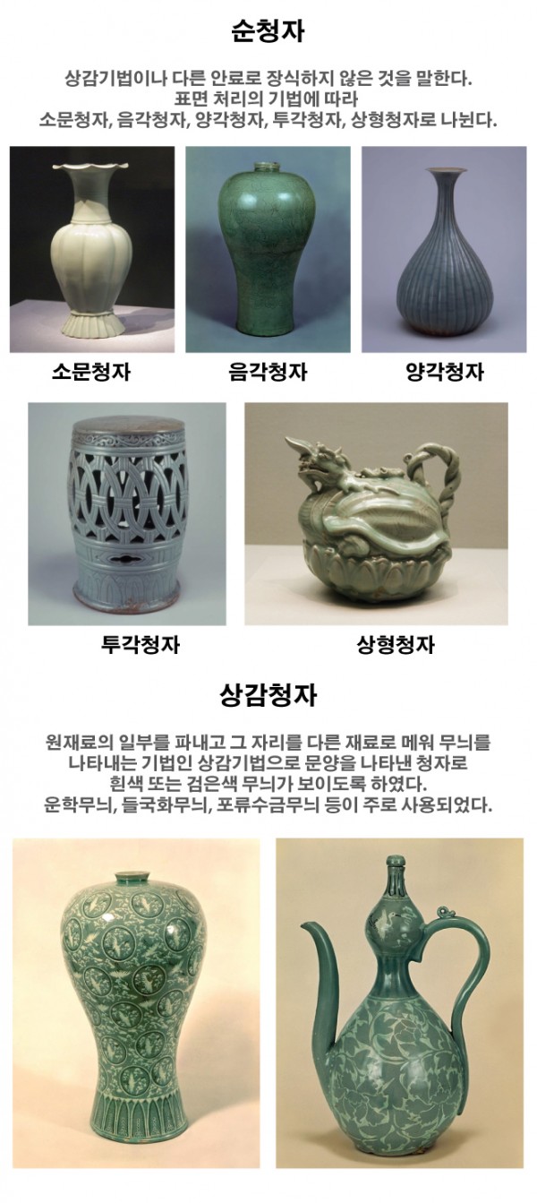11세기의 순수청자, 12·13세기의 상감청자(무신집권기 때 전성기를 이루고, 원간섭기 이후에 퇴조함)의 생김새를 알아둬.