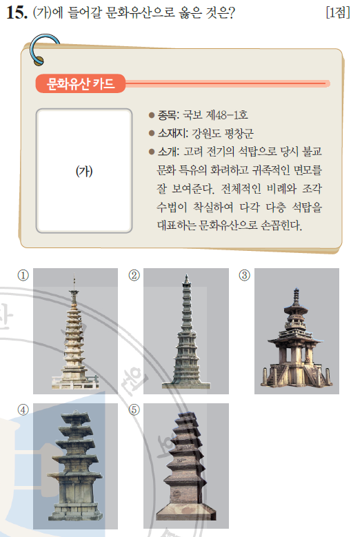 1번 : 월정사 8각 9층 석탑은 고려 전기 다각 다층 석탑. 정답!