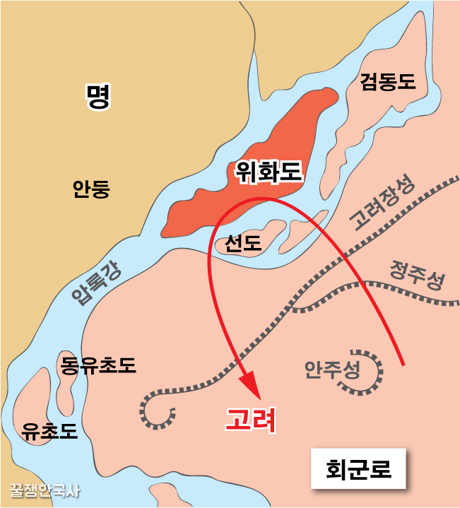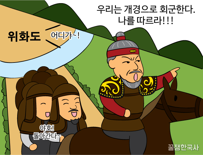이에 따라 4불가론을 내세워 위화도에서 명을 정벌하러 출진한 군사들의 칼날을 죄다 궁궐로 돌려버려.<★★★>