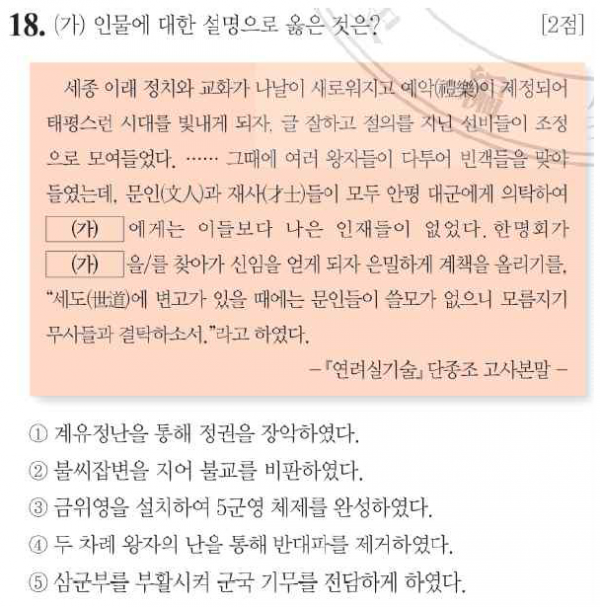 평소에 사극을 좀 봤거나, 위에 한명회라는 인물을 캐치했으면 바로 맞출 수 있는데, 그것이 아니라면 좀 추리를 해야 할거야.