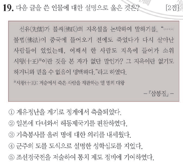 그리고 조선경국전<★★>, 경제문감(경제육전 아니다. 육전은 조준이 만듬. 명칭 잘 기억해둬), 불씨잡변<★★>을 편찬하여 불교를 철저하게 배척했으며, 주례를 국가의 통치 이념으로 중요하게 여김.