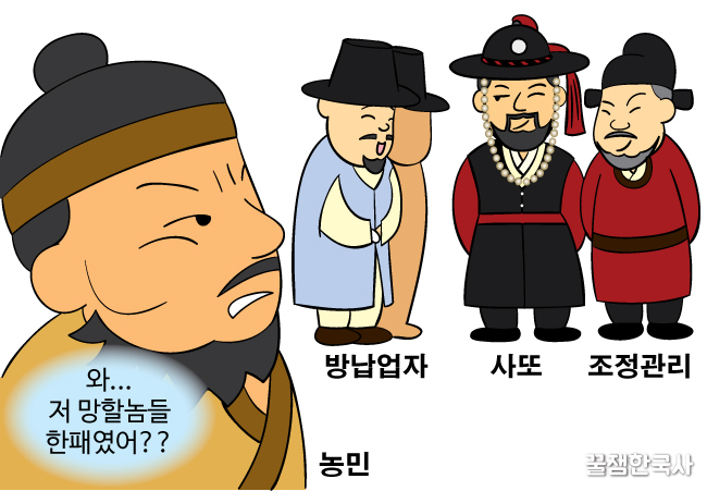근데 이것도 나중에 가면 또 변질이 돼; 세도정치시기에 마을 단위로 한꺼번에 걷는 등 백성들 등골을 아주 휘어버렸지 ㅡ.ㅡ