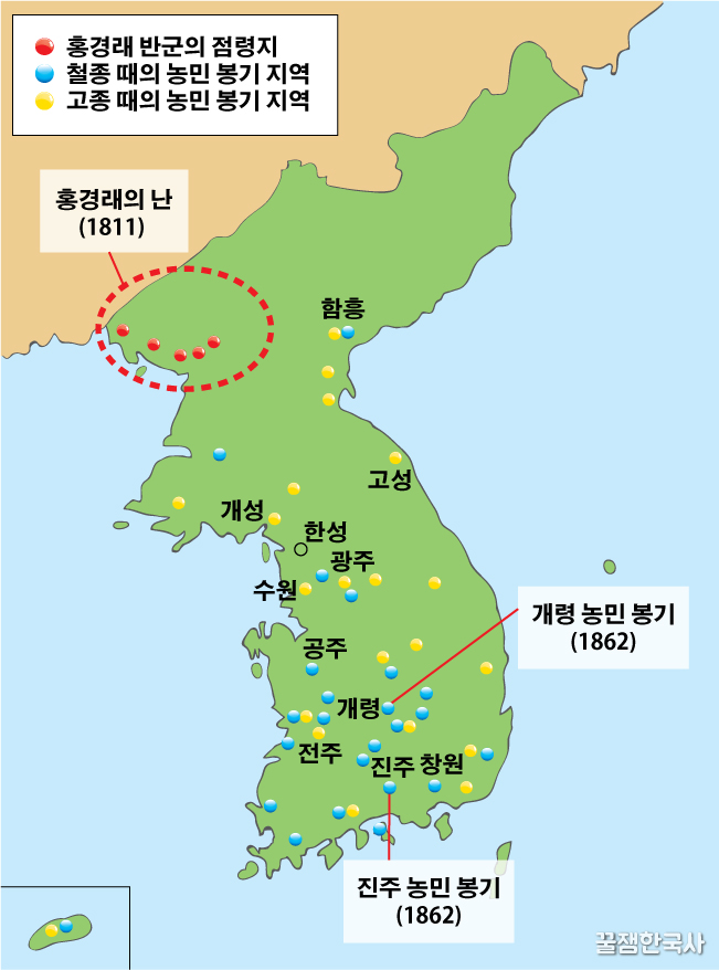 ● 홍경래의난(1811. 순조. 가산의 토적. 평안도 지역 차별. 평서대원수). 개령농민봉기(1862. 철종. 삼정의 문란). 진주농민봉기(1862. 철종. 임술농민봉기. 유계춘. 삼정의 문란. 안핵사 박규수. 삼정이정청)