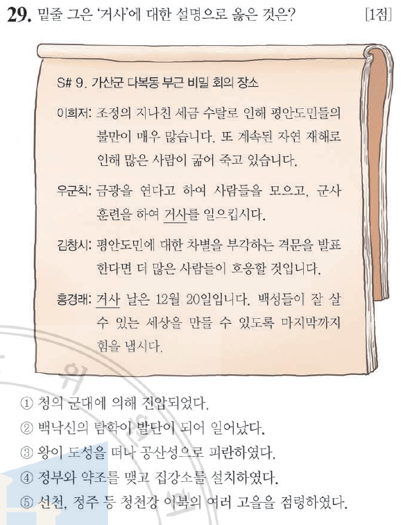 몰락양반 출신인 수장 홍경래는 평서대원수를 자처하며 청천강 이북 지역까지 세력을 확장하였지만, 5개월 만에 정주성에서 진압당하지.<★★>