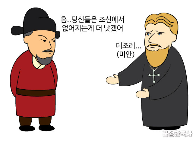 대원군은 프랑스 선교사들은 조선에 쓸모없는 놈들이라 판단하여 천주교를 탄압하기 시작해.