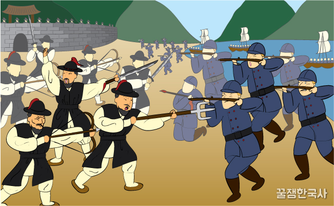 이에 미국은 5년 후인 1871년 4월<★★>에 아시아함대 5척의 군함으로 1230명을 이끌고 강화도로 침공해. 이 사건이 바로 신미양요야.