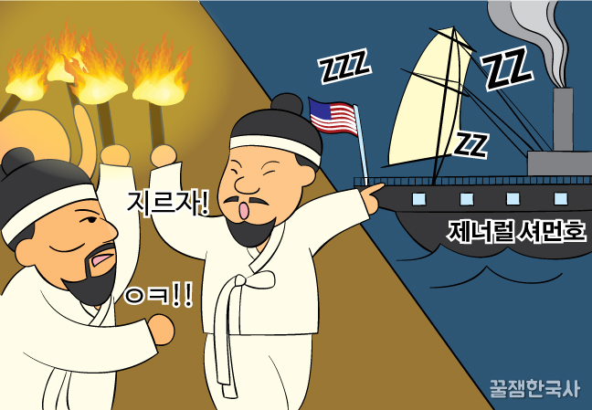 병인양요가 있던 그 해인 1866년 7월<★★★> 미국 상선 제너럴셔먼호가 평양<★>에 들어와서 통상을 요구하며 조선 백성들을 약탈한 사건이 있었어.
