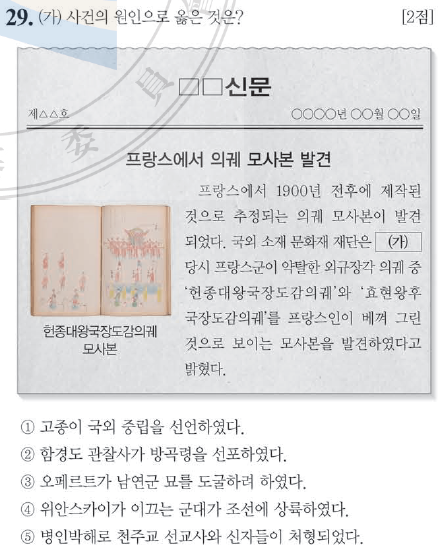 이때 약탈당한 조선왕조의궤는 프랑스 국립도서관에서 발견되었고, 2011년 현재 5년마다 갱신이 가능한 대여 방식으로 반환되어 우리나라 국립중앙박물관에 보관되어 있다는 것을 기억!