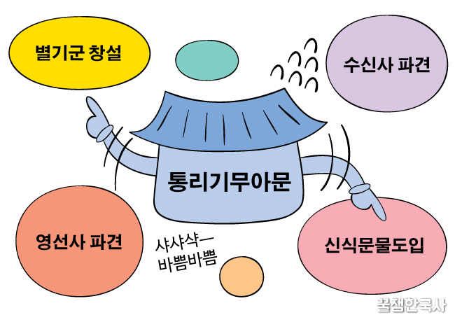 밑에 12사<★>를 두고 별기군창설<★★>, 조사시찰단과 영선사를 파견하는 등의 일을 했단다.