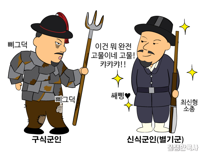 그래서 조선의 군대는 신식군대인 별기군과 구식군대인 2영(무위영+장어영)으로 나뉘어져.