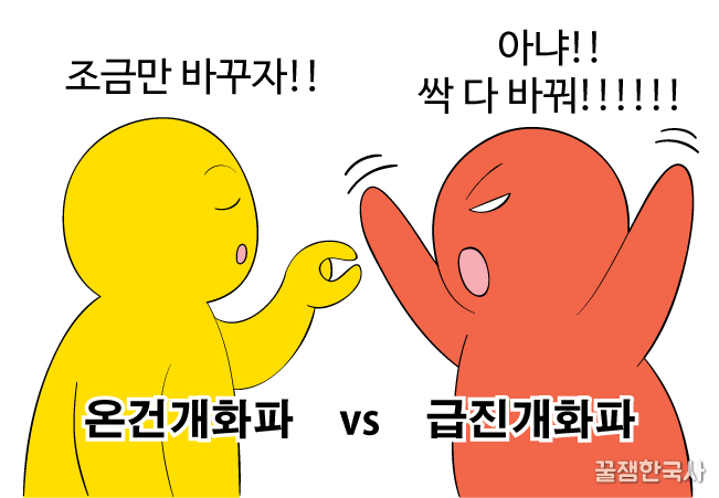 전자는 청나라의 양무운동처럼 정신문화는 유지하되 발전된 기술만 받아들이는 동도서기의 입장이요, 후자는 일본의 메이지유신처럼 기술뿐만이 아니라 정치제도 및 사상도 바꾸자며 문명개화를 하자는 입장이란다.