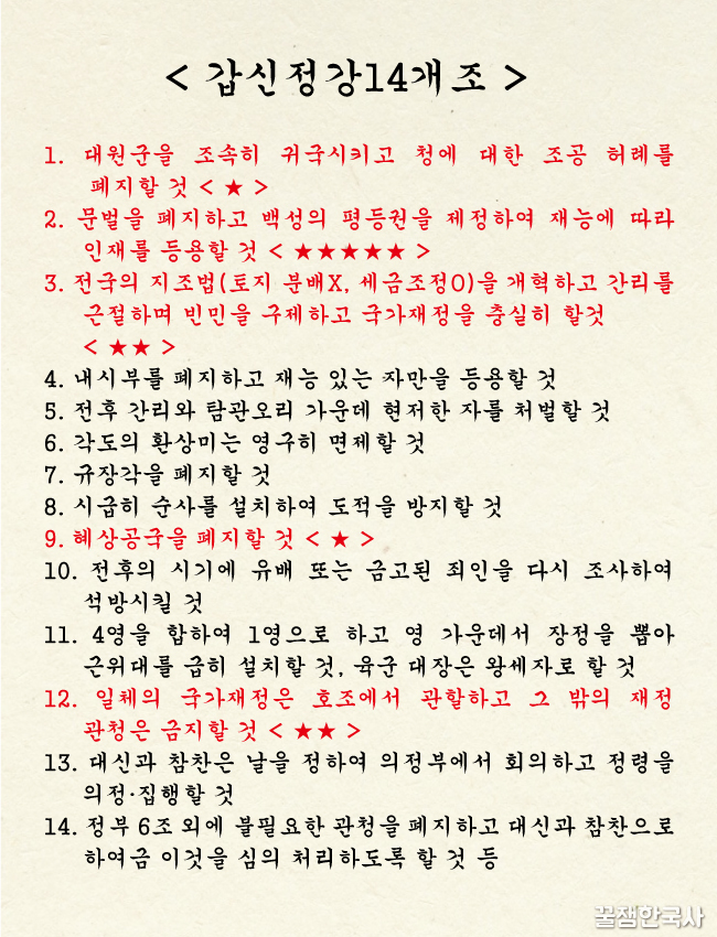 내시부를 폐지할 것, 대원군 돌려보낼 것, 조공 금지, 규장각 폐지, 순사제도 설치 등 대단히 급진적인 개화 내용을 담은 정강이지.