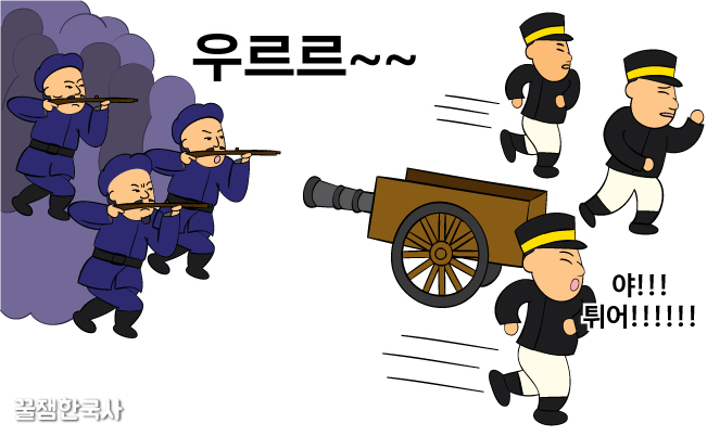 순식간에 아수라장이 된 우정국 안에 있던 사람들은 문밖으로 뛰쳐나가기 시작해.