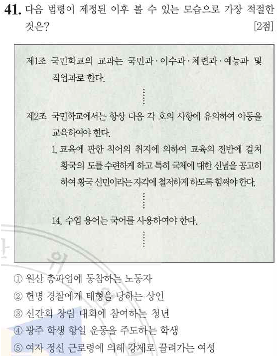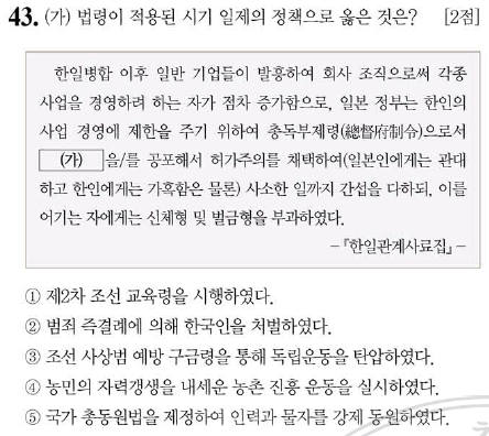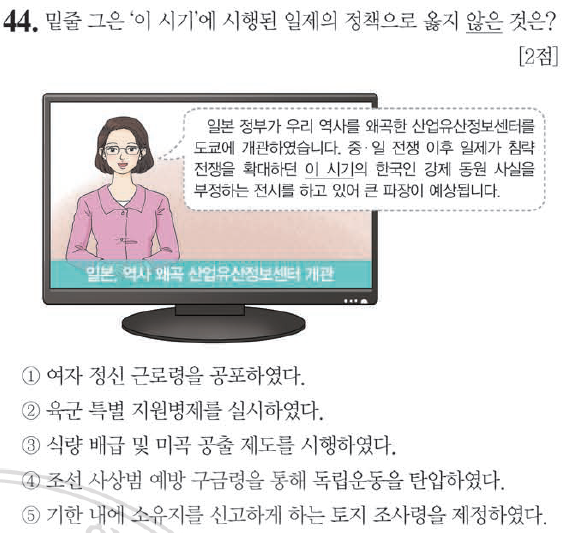 5번 : 여자 정신 근로령은 1944년 민족말살통치 시기. 정답!