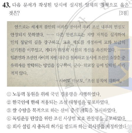 (2) 보통 경찰제 : 무시무시한 군인들로 구성된 헌병경찰들을 보통경찰로 바꿔. 하지만 이건 제복만 갈아입은 것이고, 오히려 경찰 인력을 4배로 늘림; 그리고 독립운동가 잡아들이는 고등경찰제를 시행한단다.