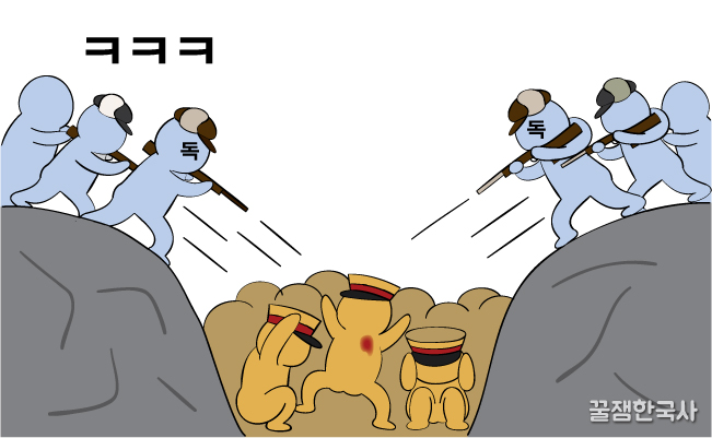 숫자만 많으면 뭐해... 갑자기 위에서 총알이 마구 날라 오는데 당황해서 싸울 수나 있겠어.