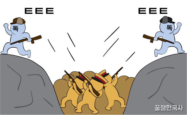 머릿수가 딸린 우리 독립군은 지리적으로 유리한 위치를 선점하여 매복하고 있다가 일본군이 오자 사격을 가하지.