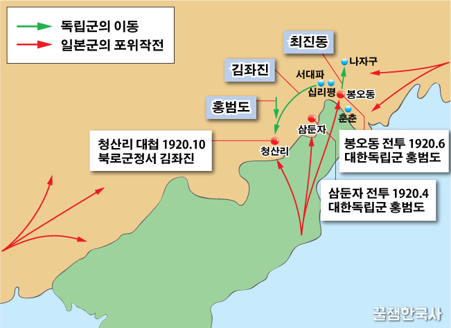 ● 일본군이 포위망 좁혀옴 → 북로군정서(김좌진)+대한독립군(홍범도)+기타세력 전투 준비 → 청산리 백운평을 시작으로 전투 개시 → 갑산촌, 천수평, 고동하, 어랑촌 등 10여 차례 전투에서 일본군 사살