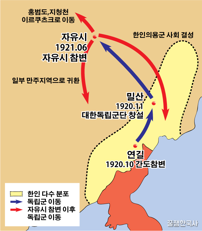 ● 청산리전투에서 주민들이 협조를 한 이유로 일본군이 그들을 학살(경신참변) → 독립군 밀산부로 퇴각 → 대한독립군단 조직 → 자유시로 이동