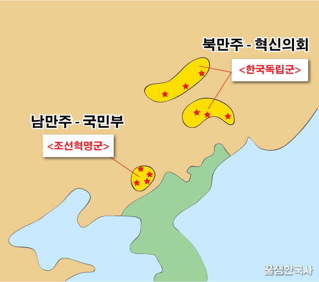 참의부(1923. 임시정부 소속)! 정의부(1924. 양기탁,지청천)! 신민부(1925. 김좌진. 대종교 계통 인사들이 조직!)<★>